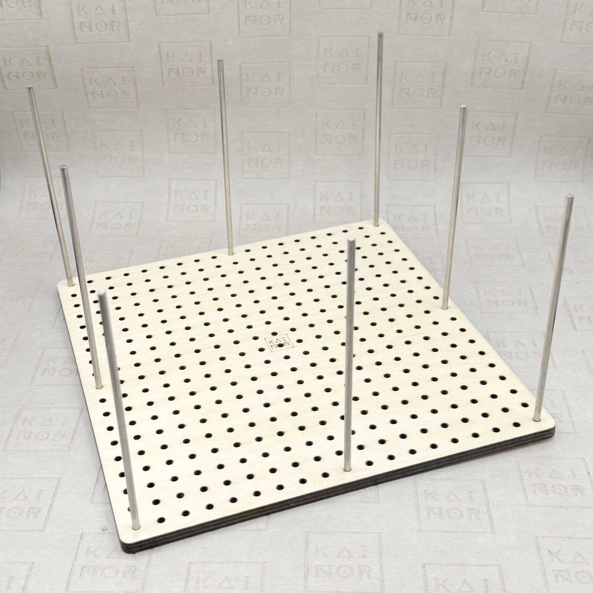 The set includes a blocking board measuring 19.5 cm x 19.5 cm and 10 stainless steel rods, each 12 cm(4,72 inch) long. The rods are inserted from the top into the blocking board, where they stay securely in place in this 6 mm thick plywood base. Before first use, it’s recommended to wash the rods gently with water and a mild detergent to remove any residue from the manufacturing process.